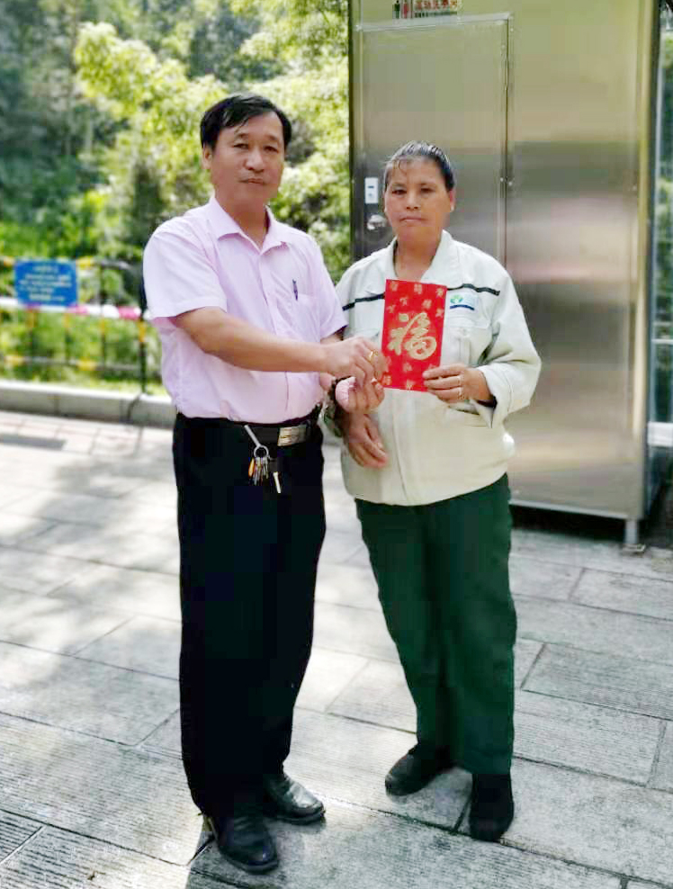 今天,福田A1項目梅林公園三圣宮公廁員工劉桂珍臉上充滿著幸福的笑容,且看,原來是項目經理給她發(fā)大紅包呢!有什么喜事呢?