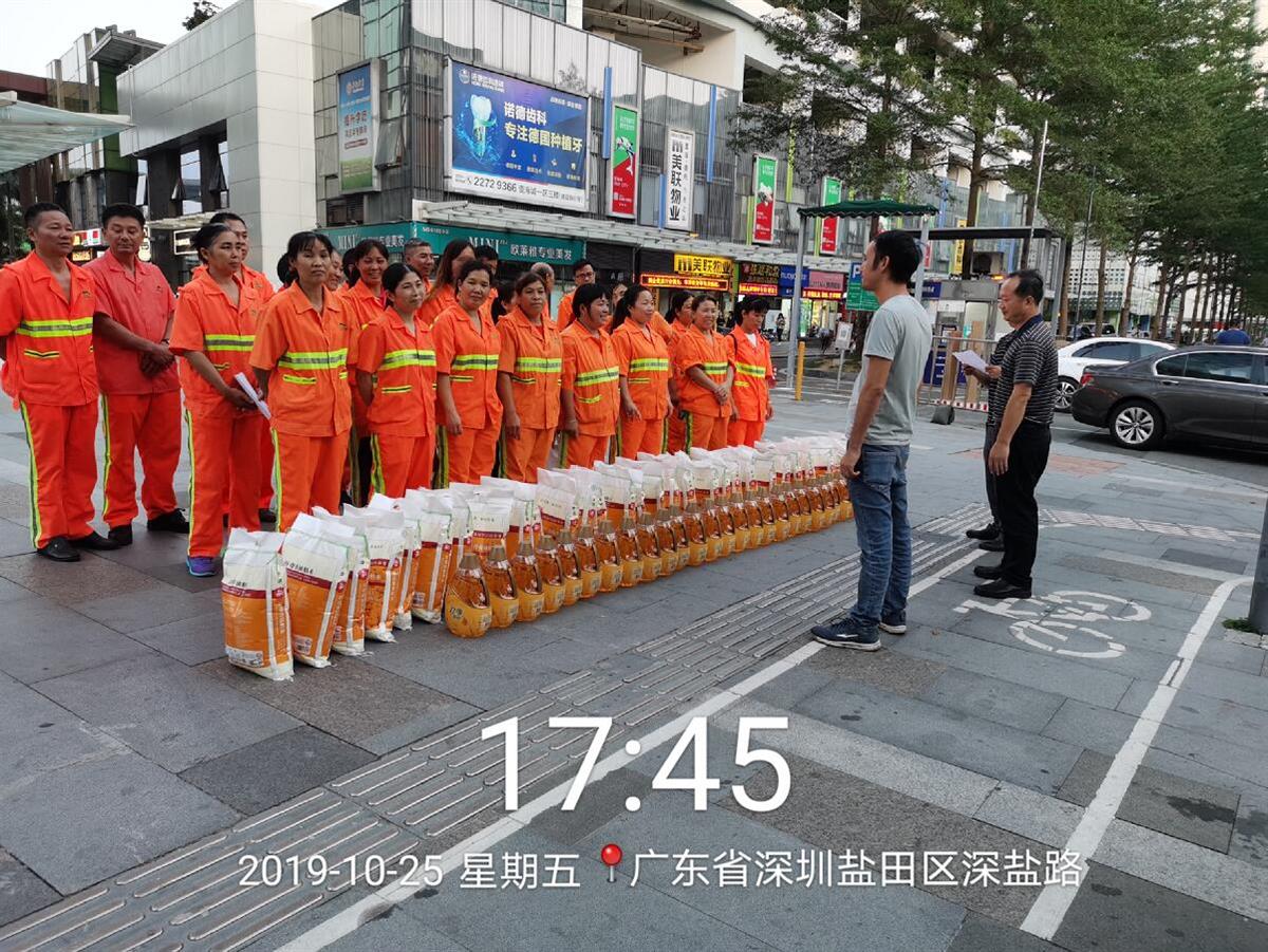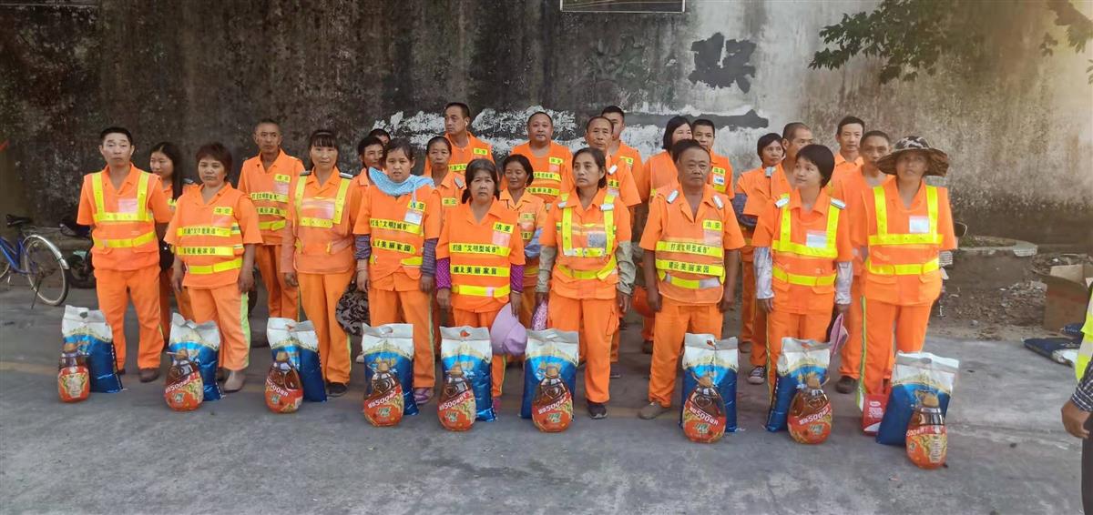 從10月21日到26日,潔亞各項(xiàng)目所在區(qū)和街道、社區(qū)就為我們環(huán)衛(wèi)工人精心準(zhǔn)備了大米和食用油,區(qū)書記、街道書記及領(lǐng)導(dǎo)們親自到項(xiàng)目上、環(huán)衛(wèi)工人作業(yè)崗位上,把一袋袋大米、一桶桶食用油交到我們環(huán)衛(wèi)工人手中,并對(duì)她們表示親切的慰問(wèn),并與她們一起勞動(dòng),一起交流環(huán)衛(wèi)作業(yè)心得,一起有說(shuō)有笑,一起為城市的潔凈出力……