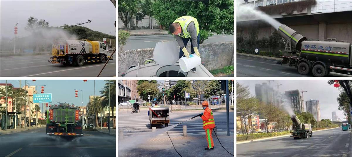 3、路面消毒方面:各項目使用大型水車、霧炮車加注消毒液、消毒粉對主干道、機動車道、輔道、綠化帶進行全面消毒。每天對紅綠燈路口約3000平方米范圍內(nèi)進行消毒2次。在疫情嚴(yán)重地區(qū),安排人員適當(dāng)加班,加強消毒頻次。