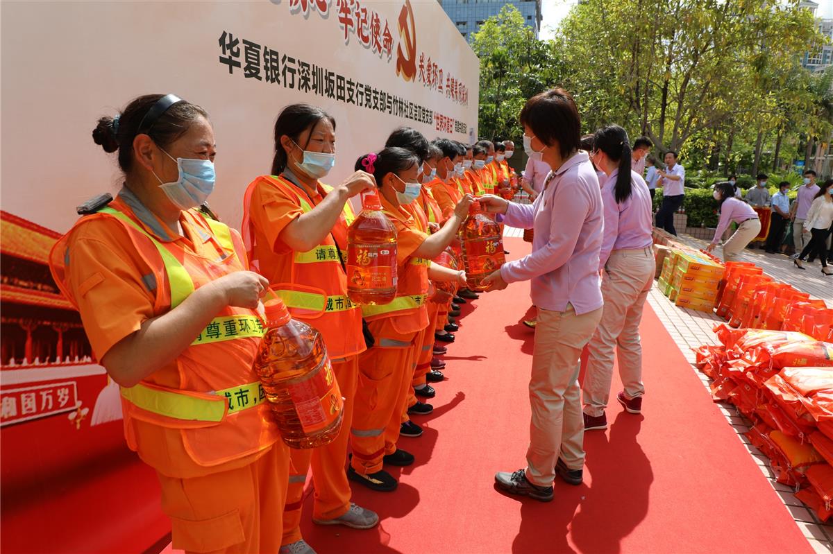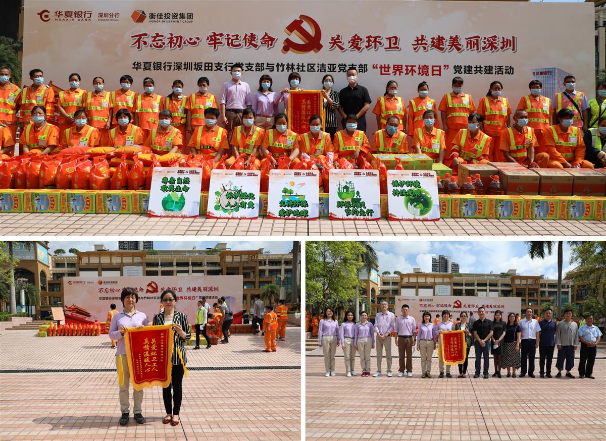 6月5日是世界環(huán)境日,由華夏銀行深圳坂田支行黨支部和潔亞黨支部共同舉辦的一場(chǎng)主題為“不忘初心,牢記使命,關(guān)愛環(huán)衛(wèi),共建美麗深圳”黨建共建活動(dòng)在東海城市廣場(chǎng)勝利舉行。市工商聯(lián)黨組成員、市非公黨委專職副書記王曙彩,華夏銀行深圳分行黨委委員、副行長(zhǎng)龐玉娟,香蜜湖街道人大工委主任、黨工委副書記陳國(guó)才,衡佳投資集團(tuán)總裁、潔亞環(huán)保董事長(zhǎng)朱小萍等領(lǐng)導(dǎo)及30多名環(huán)衛(wèi)工人代表參加了此次活動(dòng)。