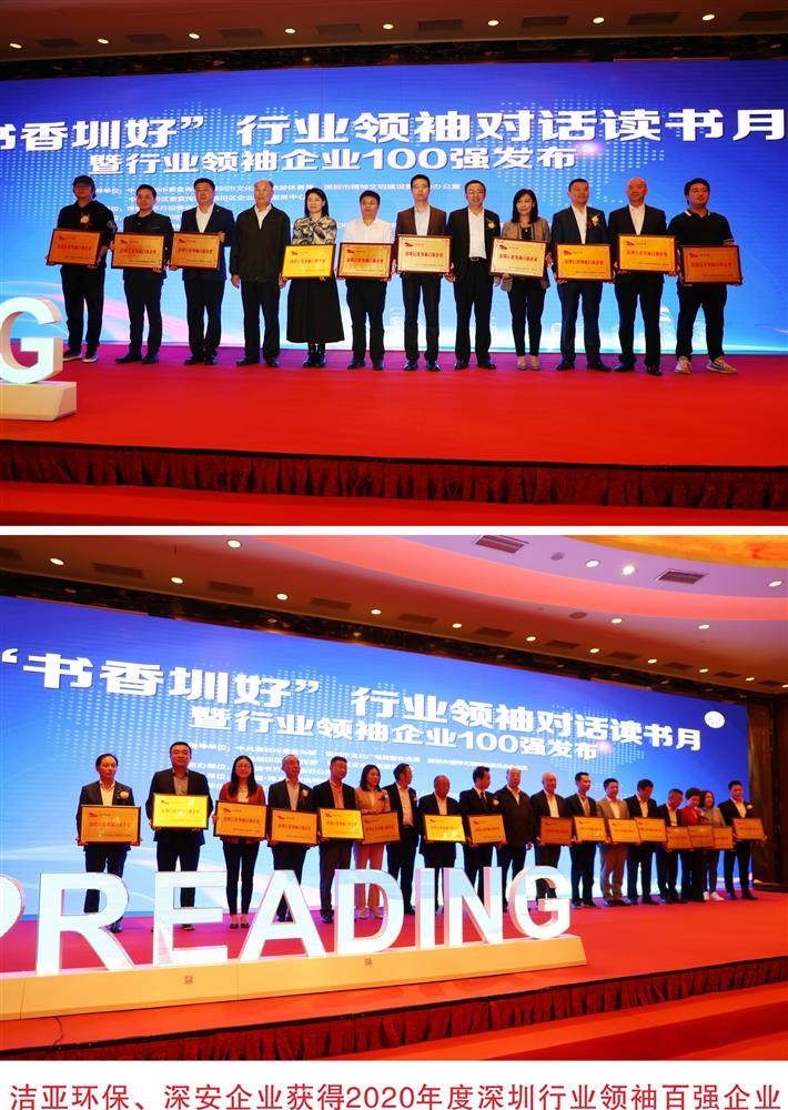 2020年11月30日,由深圳市行業(yè)領袖企業(yè)發(fā)展促進會主辦的“書香圳好” 行業(yè)領袖對話讀書月暨行業(yè)領袖企業(yè)100強發(fā)布在深圳市福田區(qū)隆重舉辦。潔亞環(huán)保喜獲“深圳行業(yè)領袖企業(yè)100強”,同時上榜獲得此榮譽的還有我們衡佳集團旗下的深安企業(yè),可謂是“雙喜臨門”,見證了衡佳集團深厚的實力和強勁的發(fā)展勢頭。