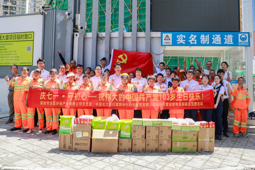 7月1日上午,在七一建黨節(jié)這個特殊的日子里,潔亞環(huán)保黨支部攜手光大銀行深圳分行辦公室黨支部和深圳分行營業(yè)部黨支部共同舉辦了一場主題為“慶七一、守初心”的黨日活動,并特別策劃了“夏日送清涼”的關(guān)愛行動,為在高溫下堅守崗位的環(huán)衛(wèi)一線工人送去清涼與關(guān)懷。光大銀行深圳分行營業(yè)部總經(jīng)理趙妤、光大銀行深圳分行營業(yè)部總經(jīng)理助理肖燕、光大銀行深圳分行營業(yè)部總經(jīng)理助理林燕敏、光大銀行深圳分行辦公室副總經(jīng)理關(guān)凝、潔亞環(huán)保副總經(jīng)理謝磊、潔亞環(huán)保副總經(jīng)理廖夷盛等參加活動。