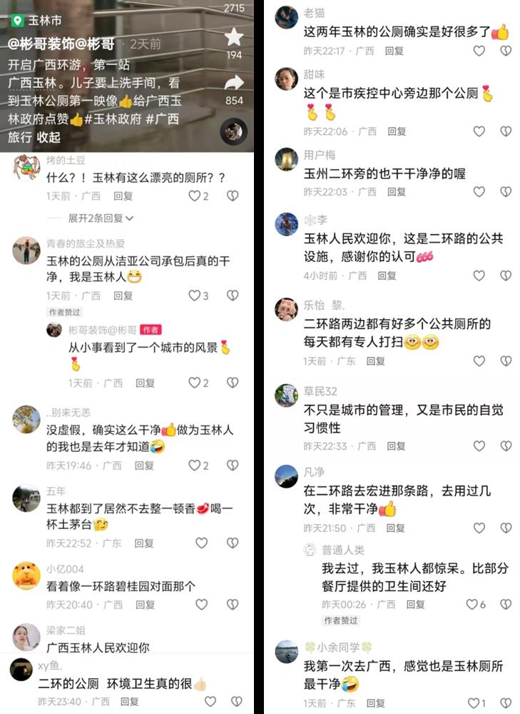“看看人家的公共廁所,衛(wèi)生干干凈凈......”近期,外地游客@斌哥裝飾 來(lái)玉林旅游時(shí)中途上廁所,錄制了視頻感嘆玉林市公共衛(wèi)生間干凈整潔,引來(lái)了不少玉林市民共鳴與外地游客評(píng)論和點(diǎn)贊。