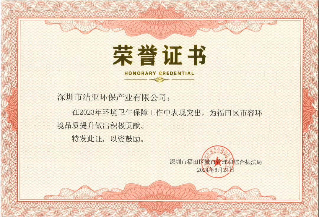 近日,深圳市福田區(qū)城市管理和綜合執(zhí)法局特向潔亞環(huán)保頒發(fā)榮譽證書,高度贊揚潔亞環(huán)保在2023年度環(huán)境衛(wèi)生保障工作中的卓越表現(xiàn)與杰出貢獻(xiàn),對福田區(qū)市容環(huán)境品質(zhì)提升做出了積極的貢獻(xiàn)。
