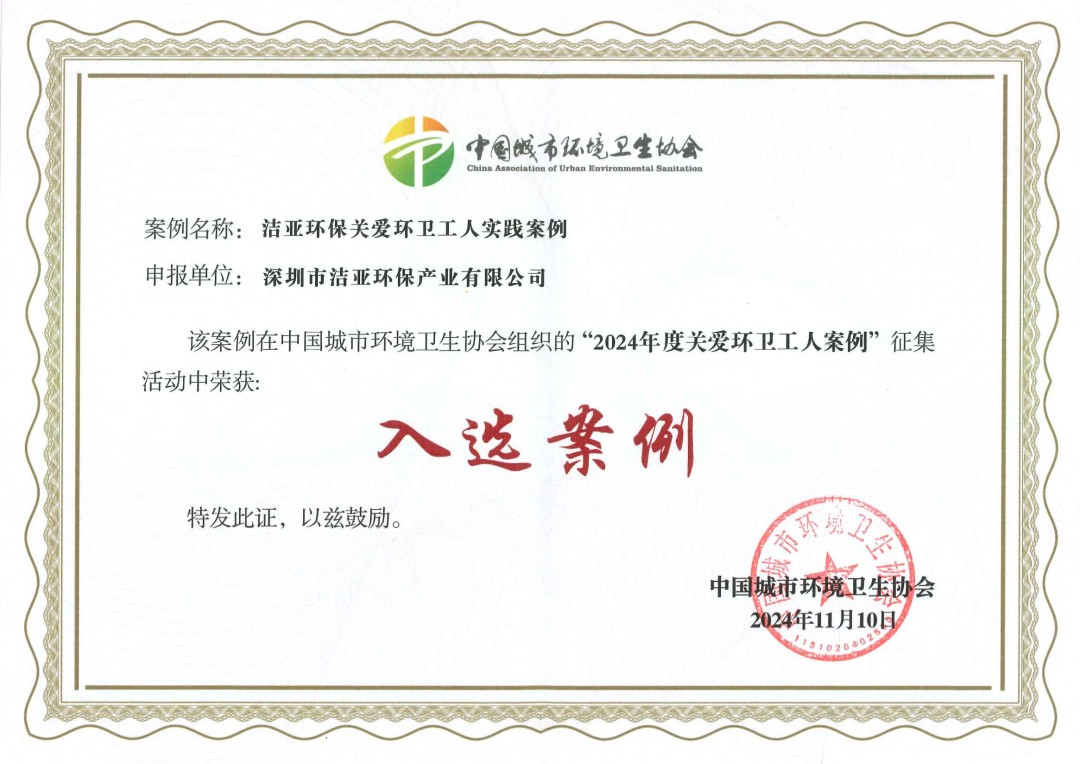 在關(guān)愛環(huán)衛(wèi)工人案例獎方面,潔亞環(huán)保始終牢記“創(chuàng)業(yè)初心”,不忘員工是“守業(yè)之本”,持續(xù)做好關(guān)心、關(guān)愛環(huán)衛(wèi)工人工作,不斷提升環(huán)衛(wèi)工人的職業(yè)獲得感、成就感、幸福感,推動智慧城市服務(wù)領(lǐng)域的進(jìn)步與發(fā)展。