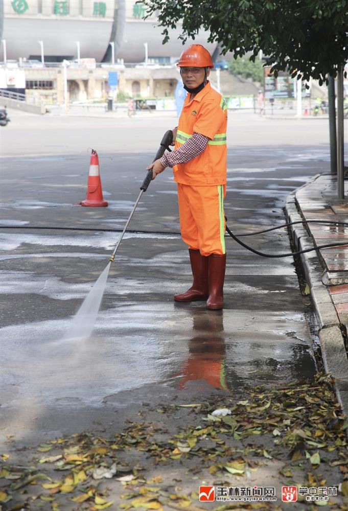 玉林新聞網(wǎng)-玉林日報訊(記者 劉 賽 通訊員 蘇莉莉)5月3日午后,烈日炙烤下的玉林城區(qū)江南大道熱浪蒸騰。下午3時許,環(huán)衛(wèi)工人梁永管駕駛著小高壓水車??吭谝惶幝房凇K鹗直?,用袖口抹了把額頭上不斷滾落的汗珠,隨后熟練地抄起高壓水槍,開始沖刷路面上的油污和垃圾。熱辣辣的陽光直射在他橙色的工作服上,汗水很快又從他的額頭滲了出來——這已是他在勞動節(jié)期間堅守崗位的第三天,也是玉林城區(qū)1800名環(huán)衛(wèi)工人假期工作的真實寫照。當城市沉浸在節(jié)日的歡愉中時,這群“城市美容師”正用掃帚丈量街道,用水槍洗滌塵埃,用汗水守護著這座城市的整潔容顏。
